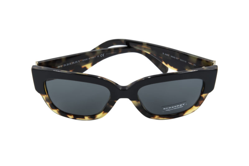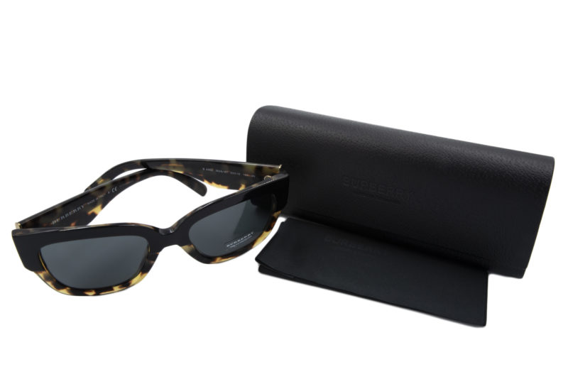 Γυαλιά ηλίου Burberry. Κοκκάλινη πεταλούδα σε καφέ ταρταρούγα & μαύρη απόχρωση. Φακοί με ολοκληρωμένη προστασία UV 400 σε μαύρο χρωματισμό. Συνοδεύεται από θήκη και πανάκι.