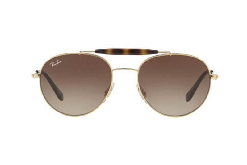 Γυαλιά ηλίου RAY BAN σε χρυσό aviator μεταλλικό σκελετό με λεπτομέρειες σε καφέ ταρταρούγα. Φακοί με ολοκληρωμένη προστασία σε καφέ degrade χρωματισμό. Συνοδεύεται από θήκη και πανάκι.